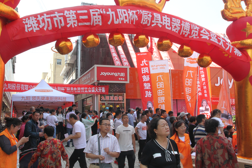 5月19日,民生西街豐華大廈廣場和豐華步行街上,“九陽杯”濰坊第三屆廚具電器博覽會開幕暨全國首家九陽品牌旗艦店開業(yè)隆重舉行。