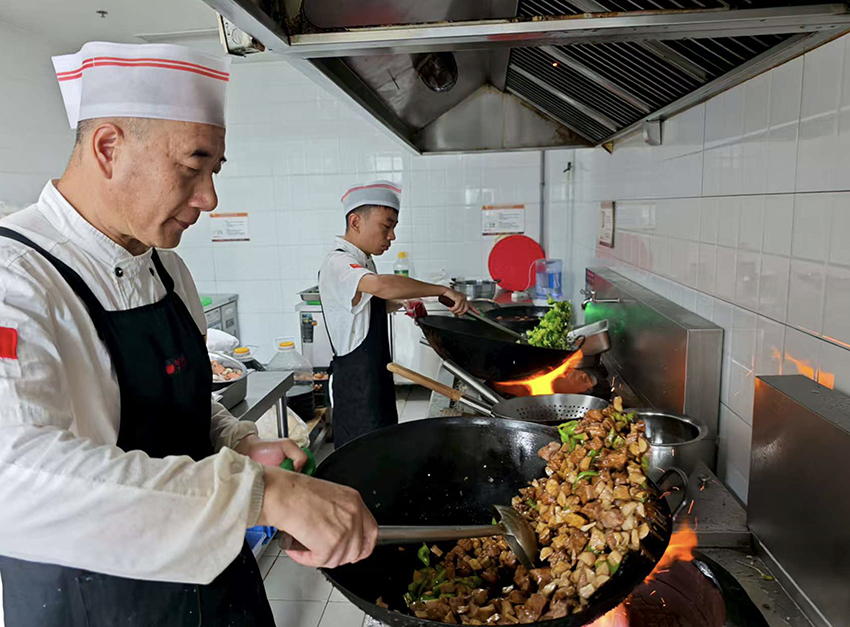 福瑞瀾德的后廚里,廚師們正緊張卻不失章法地忙碌著,全神貫注地備戰午餐時段,只為將新鮮美味的餐食及時呈給顧客,傳遞用心服務的溫度。